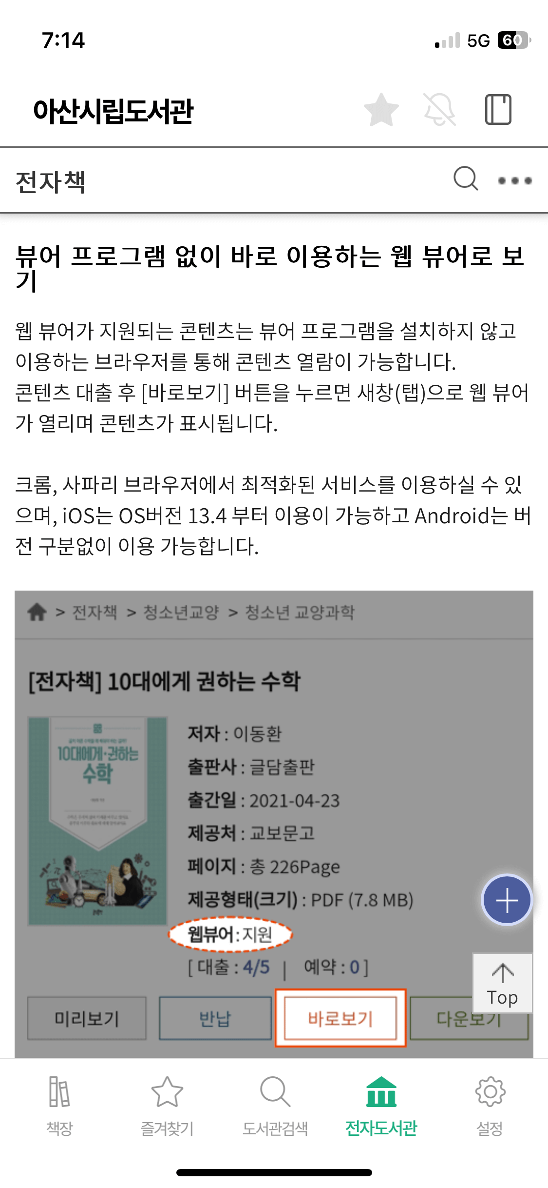 5. 대출한 도서는 바로보기 또는 다운보기를 통해 이용하실 수 있습니다. 다운보기 한 도서는 '책장'에서 확인할 수 있습니다.