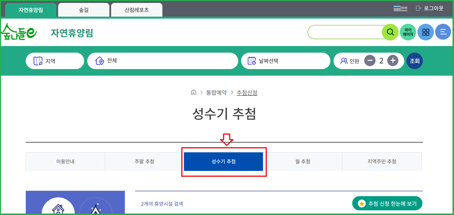 3. 이동된 통합예약 페이지에서 성수기 추첨을 클릭한 후, 원하시는 지역과 휴양림, 날짜, 인원을 선택하여 조회를 클릭합니다. 추첨 신청에는 별도의 결제가 진행되지 않으며, 당첨자 발표 후 결제 단계를 거쳐 최종 신청이 완료됩니다.
