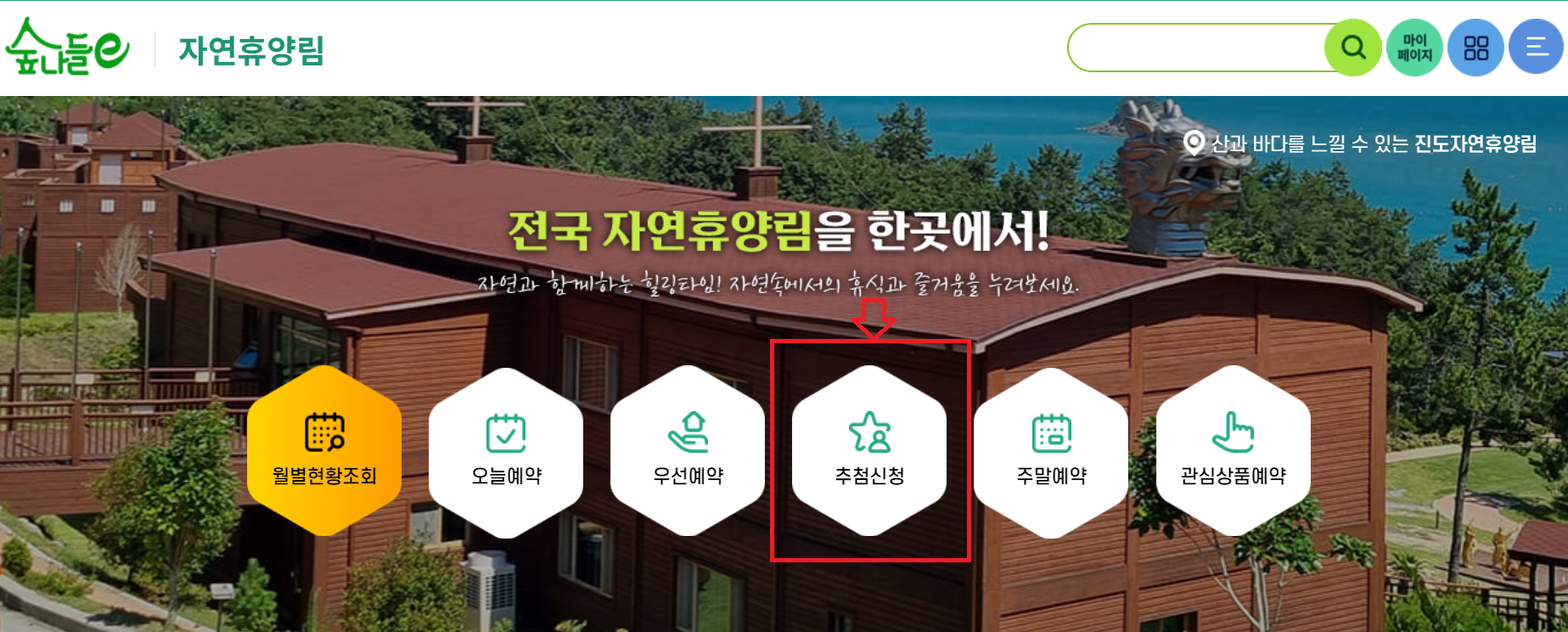 국립자연휴양림 성수기 추첨은 숲나들e 홈페이지를 통해 신청하실 수 있습니다.