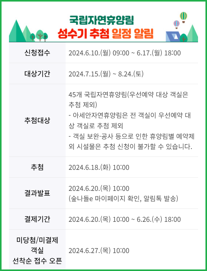 ✅숲나들e 성수기 추첨은 선착순 예약이 아니므로 사용자가 집중되는 접수 첫날을 피하여 신청할 것을 권장합니다.(추첨 신청시간과 추첨 당첨 결과는 무관합니다.)