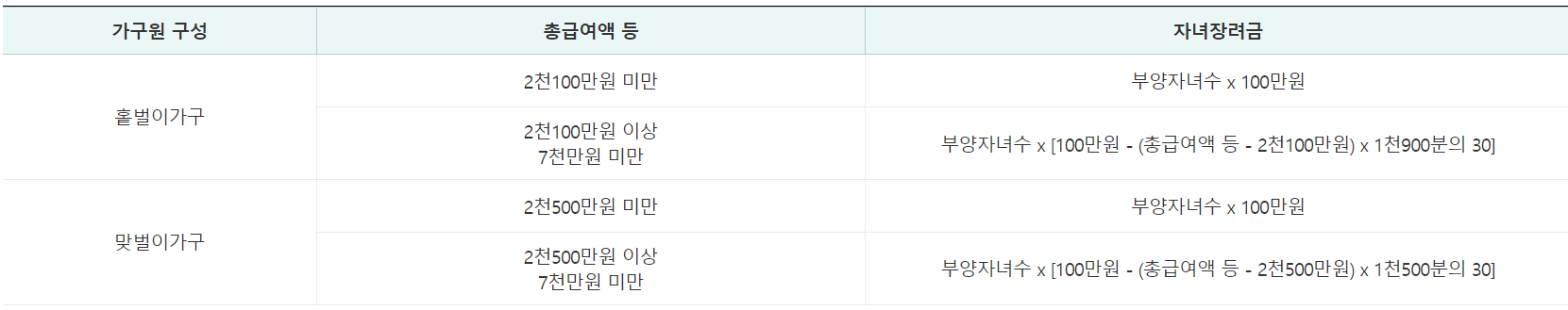전년도 연간 부부합산 총급여액 등을 기준으로 다음의 산식을 반영한 자녀장려금 산정표에 따라 계산됩니다.